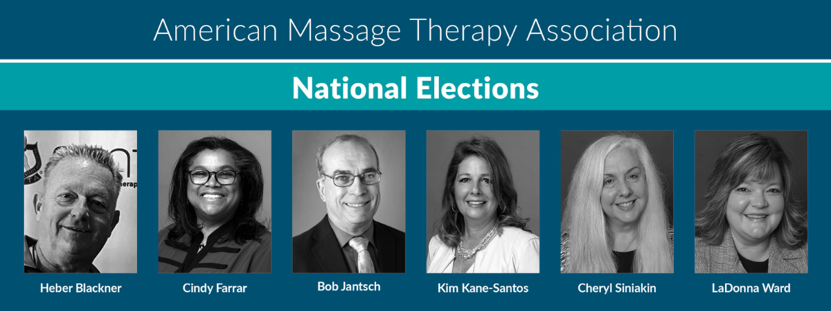 The 2022 Slate Selection Commission is proud to present this year’s American Massage Therapy Association (AMTA) National Board Election Slate for your approval and support: Heber Blackner, Cindy Farrar, Bob Jantsch, Kim Kane-Santos, Cheryl Siniakin, and LaDonna Ward.
